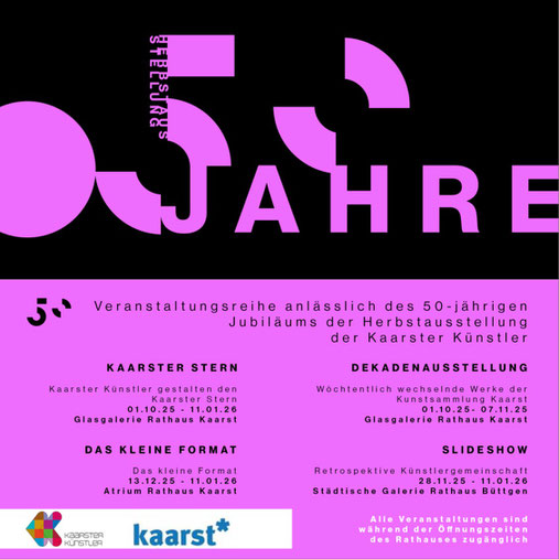 Gleichzeitig werden Werke aus der Kunstsammlung der Stadt gezeigt, die sich aus Ankäufen aus der Herbstausstellung über die 50 Jahre zusammensetzt. Die Ausstellung geht über 5 Wochen und zeigt jede Woche jeweils ein Jahrzehnt aus den Ankäufen. Sie dokumentiert das künstlerische Schaffen und die Vielfalt der in Kaarst ansässigen bildenden Künstler.